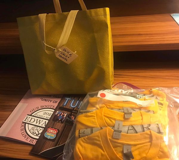 Pictured above: Edwards Family T-shirt & Gift Bags.